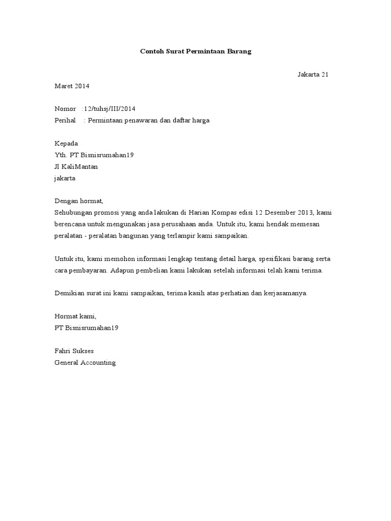Contoh Surat Permintaan Barang Jasa Yang Benar Dicontoh